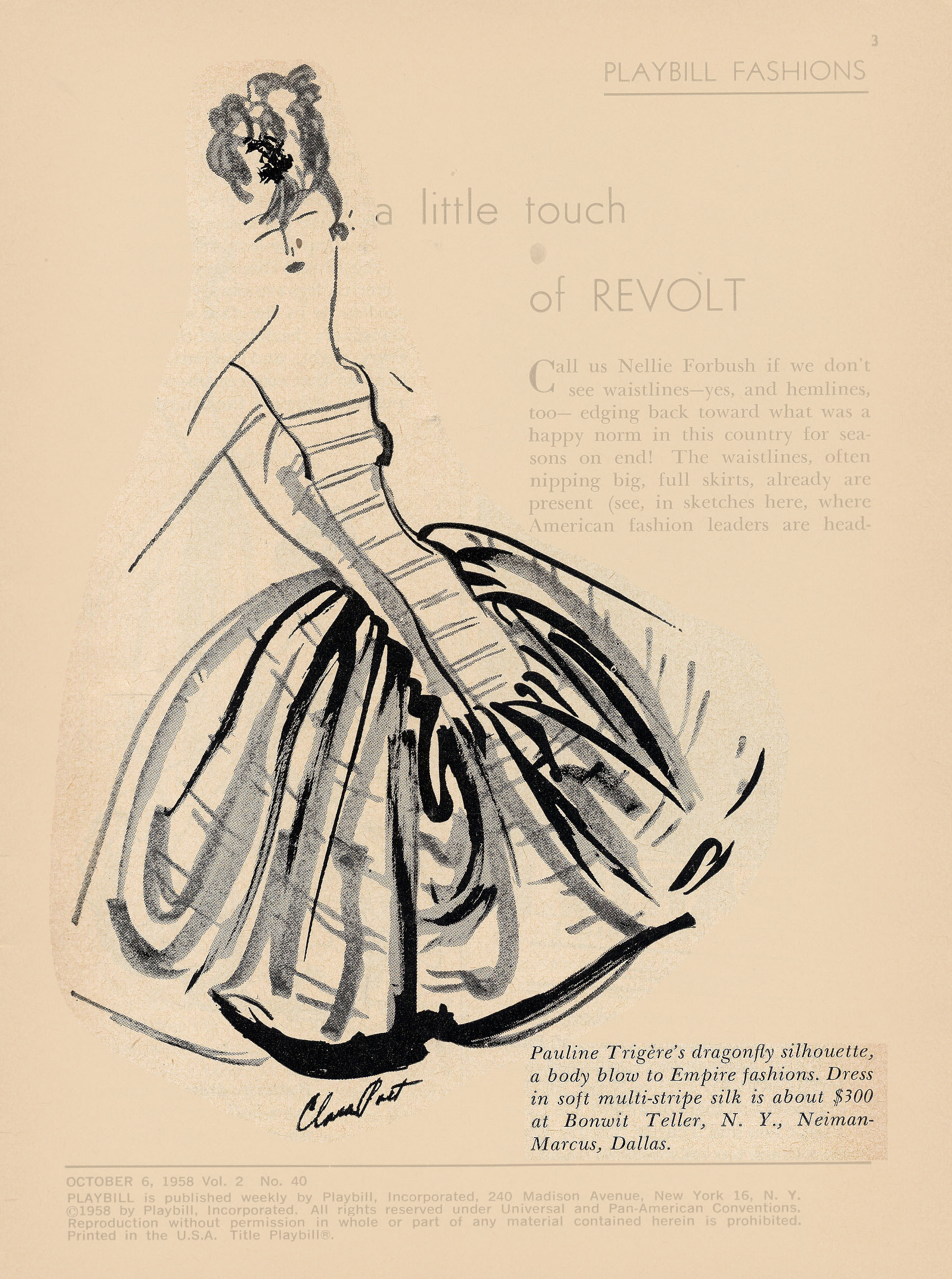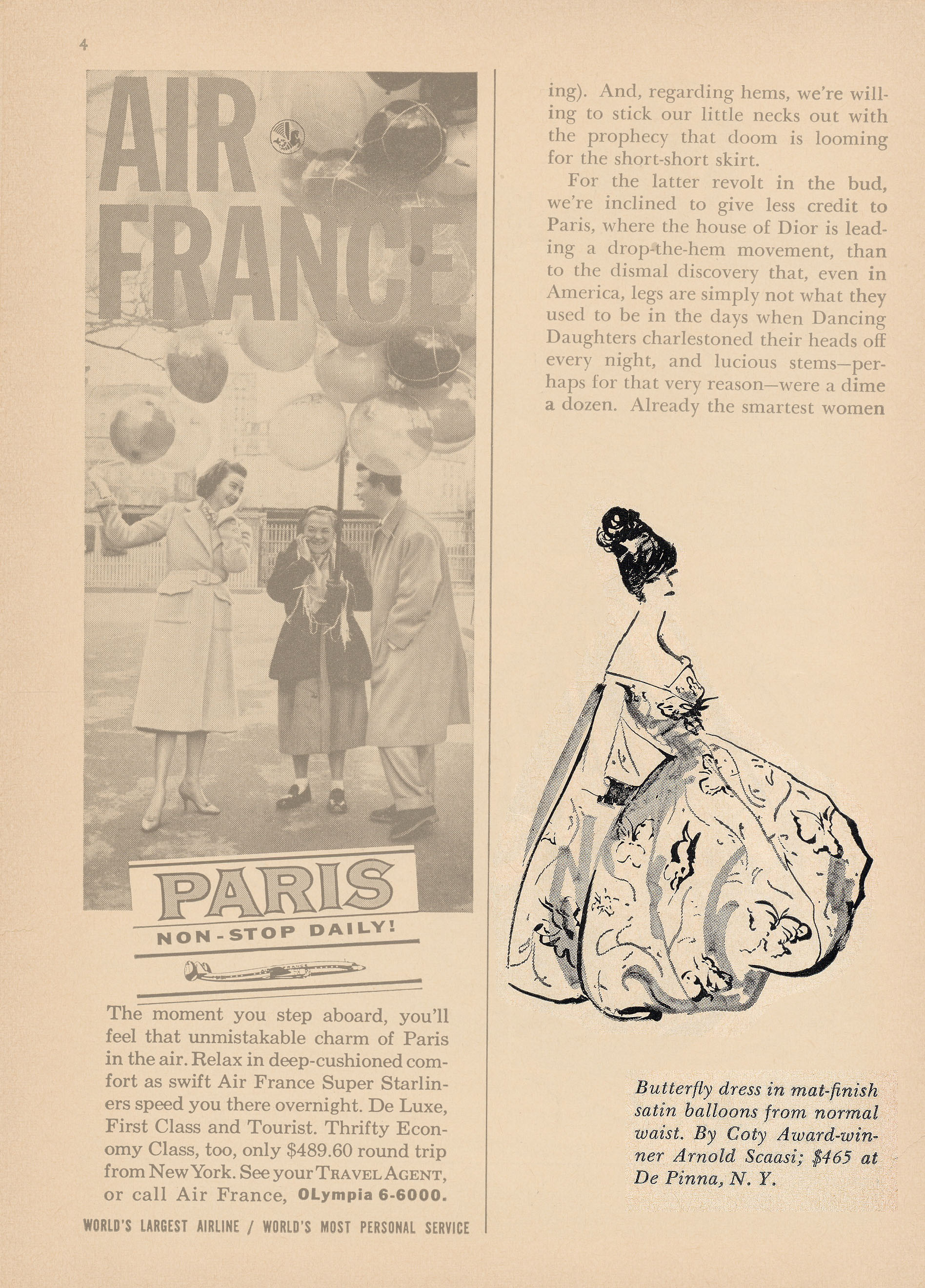 “Call us Nellie Forbush if we don’t see waistlines–yes, and hemlines, too–edging back to what was a happy norm in this country for seasons on end! The waistlines, often nipping big, full skirts, already are present (see in sketches here, where American fashion leaders are heading). And, regarding hems, we’re willing to stick our little necks out with the prophesy that doom is looming for the short-short skirt.