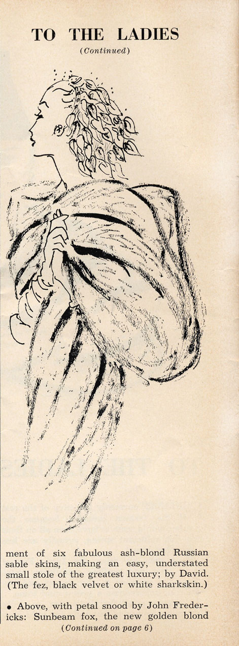 • Our small furs: Shown with the about-to-become-famous fez: Assortment of six fabulous ash-blond Russian sable skins, making an easy, understated small stole of the greatest luxury; by David. (The fez, black velvet or white sharkskin.)